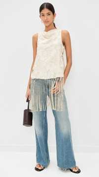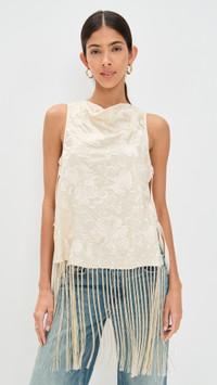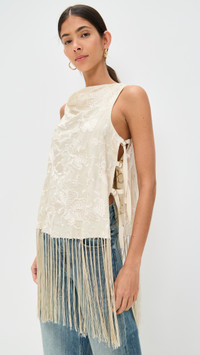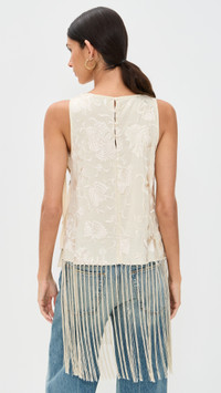 - Fabric: Lightweight, non-stretch weave - Tonal floral embroidery - Fringe trim at hem - D-ring closures at sides - Crew neck - Sleeveless - Shell: 100% viscose - Dry clean - Imported, India Style #SEAAA22459