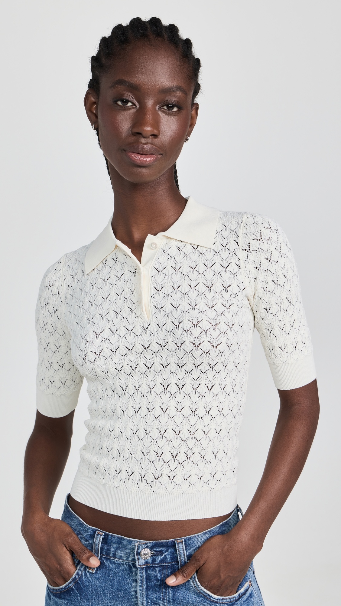 - Fabric: Lightweight, pointelle knit - 'Pointelle' pattern - Collared neck and short sleeves - Button placket - Shell: 83% viscose/17% polyester - Dry clean - Imported, China Style #SEAAA22025