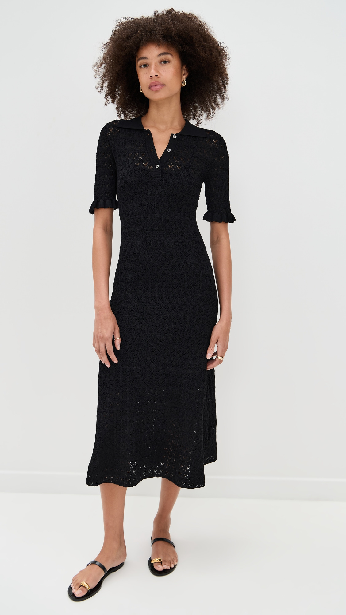 - Fabric: Mid-weight, loose knit with stretch - Ruffle cuffs - Detachable lining - Midi length - Polo neckline - Elbow-length sleeves - Partial button placket - Shell: 83% viscose/17% polyester - Lined - Lining: 92% nylon/8% spandex - Dry clean - Imported, China Style #SEAAA22443