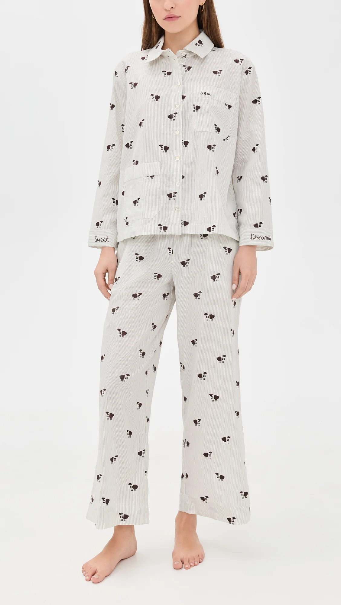 - Fabric: Lightweight, non-stretch weave - Stripe print and allover sheep embroidery - Collared neck - Long sleeves with button cuffs - Button placket - Covered elastic waist with drawstring - On-seam side pockets and patch breast pocket - Shell: 100% cotton - Trim: 100% polyester - Dry clean - Imported, India Style #SEAAA22525