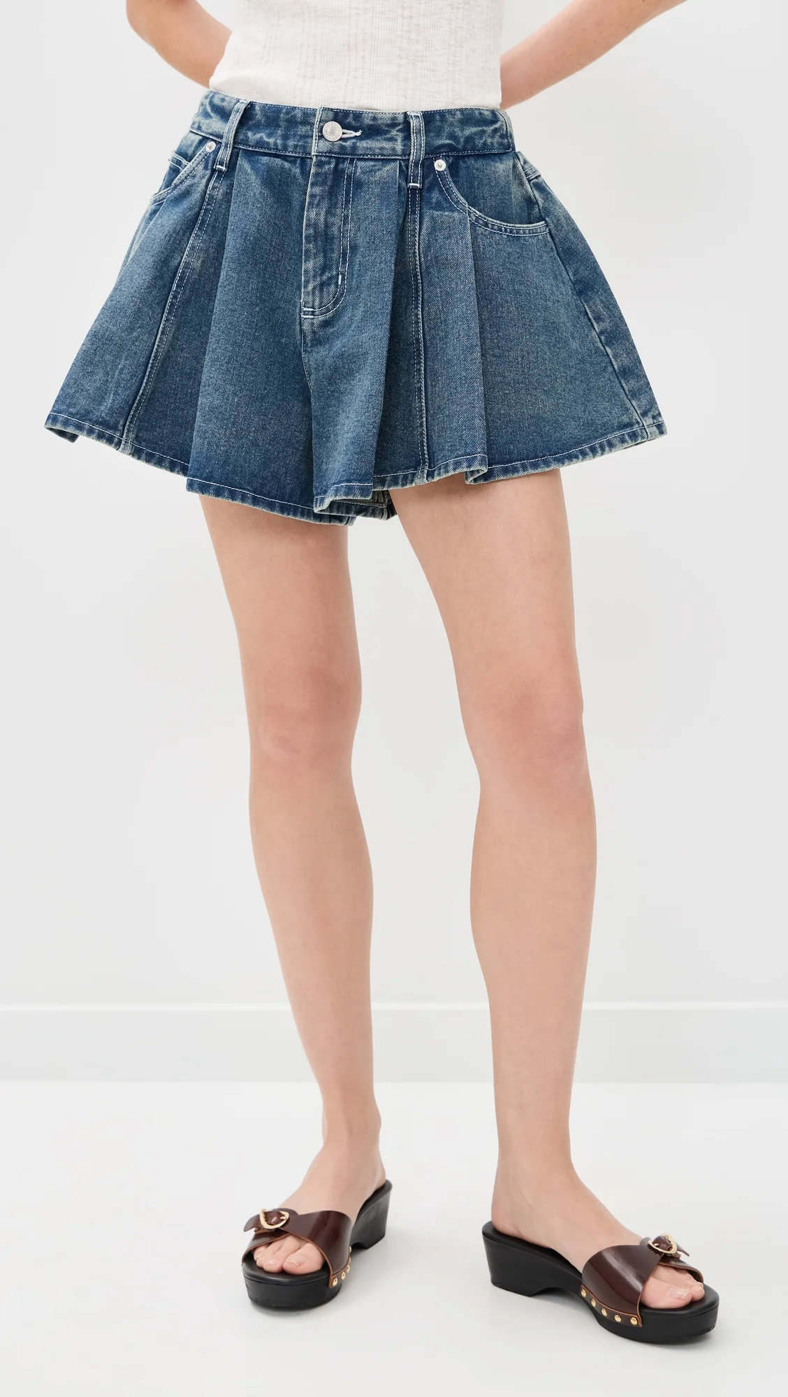 - Fabric: Mid-weight, low-stretch denim - Pleated at front and back - Button closure and zip fly - Partial elastic waistband - 5-pocket styling - Shell: 90% cotton/10% viscose - Dry clean - Imported, China Style #SEAAA22655 Size & Fit Measurements from size 2 Rise: 13.5in / 34cm Inseam: 2.25in / 6cm
