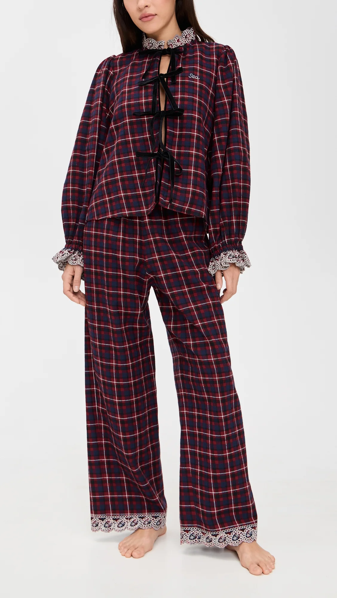 - Fabric: Mid-weight, non-stretch flannel - Plaid pattern - Eyelet trim - Mock neck - Long sleeves with elastic cuffs - Covered elastic waistband - Ties at front - Slant hip pockets - Shell: 100% cotton - Dry clean - Imported, China Style #SEAAA22522