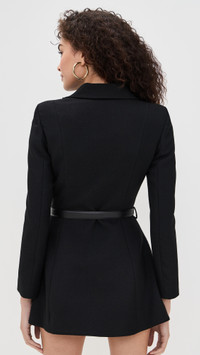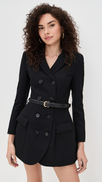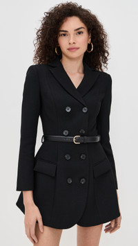 - Fabric: Mid-weight, low-stretch wool crepe weave - Optional, adjustable cowhide belt - Built in shoulder pads - Mini length - Collared neck - Long sleeves - Double-breasted button placket - Flap front pockets - Shell: 44% wool/31% polyester/23% viscose/2% elastane - Lined - Lining: 100% cupro - Dry clean - Imported, China Style #SELFP30923 Size & Fit Customers say: Runs small; please size up. Model measurements: Size 2: Brianna (5'9") usually wears size 0 Measurements from size 2 Length: 30in / 76.0cm, from shoulder