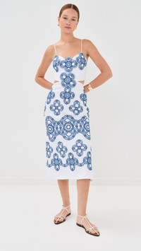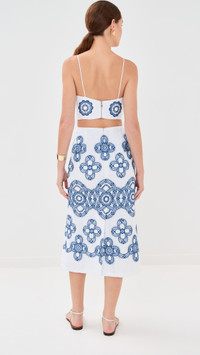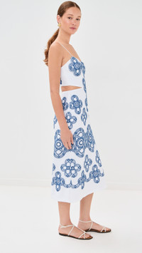 - Fabric: Lightweight, non-stretch linen weave - Cutout at back - Embroidered pattern - Midi length - Sweetheart neckline - Sleeveless - Zip at back - Shell: 90% linen/8% cotton/2% polyester - Unlined bodice, lined skirt - Wash cold - Imported, Colombia Style #STCHE30360 Size & Fit Model measurements: Size XS: Maia (5'10") usually wears size XS Measurements from size S Length: 38.25in / 97.0cm, from center back