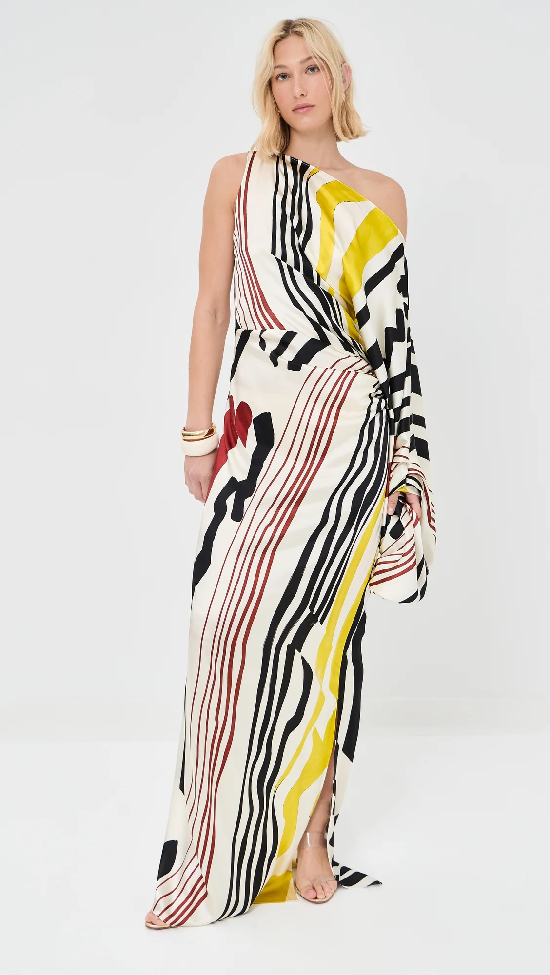 - Fabric: Lightweight stretch satin - Draped left long sleeve - Gathered waist - Maxi length - One-shoulder neckline - Long sleeves - Hidden zip at side - Shell: 92% silk/8% elastane - Unlined - Dry clean - Imported, Colombia Style #STCHE30372 Size & Fit Model measurements: Size S: Jade (5'9") usually wears size XS Measurements from size XS Length: 63.5in / 161.0cm, from shoulder