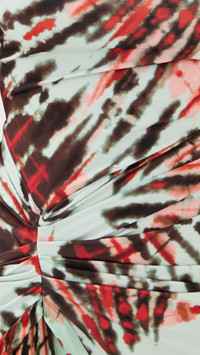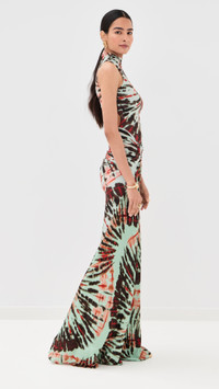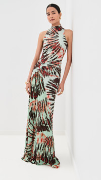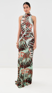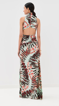 - Fabric: Lightweight, super-stretch slinky jersey - Tie-dye pattern - Cutout at back - Ruching at waist - Maxi length - Mock neck - Sleeveless - Zip at back - Shell: 51% polyester/42% viscose/7% elastane - Unlined - Wash cold - Imported, Colombia Style #STCHE30363