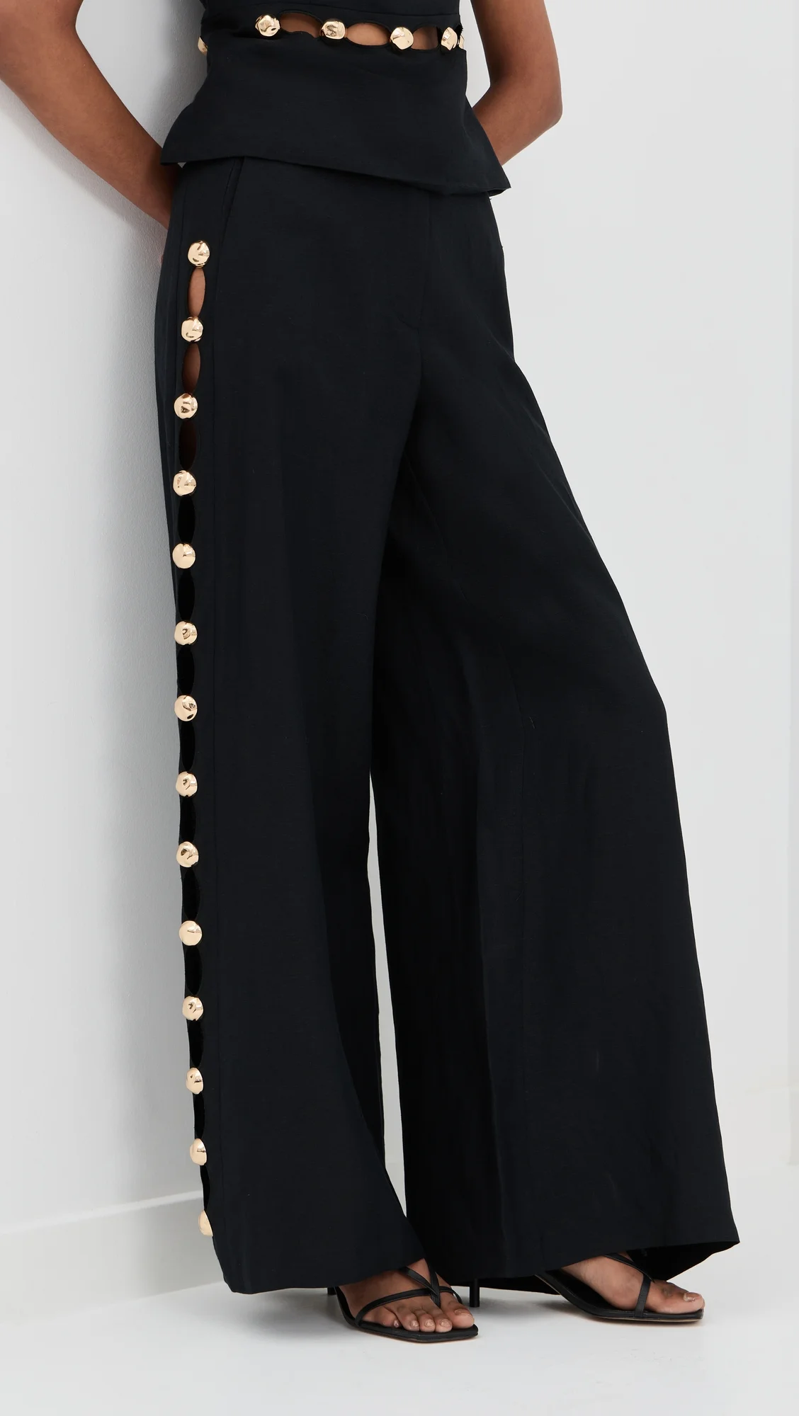- Fabric: Lightweight, non-stretch linen weave - Chunky gold-tone hardware and cutouts at sides - Hook-and-eye closures at waist, zip fly - On-seam side and faux welt back pockets - Shell: 55% linen/45% viscose - Dry clean - Imported, China Style #JONDB31904 Size & Fit Model measurements: Size XS: Shaanti (5'8") usually wears size XS Measurements from size XS Rise: 11.5in / 29cm Inseam: 32.25in / 82cm Leg opening: 29.25in / 74cm