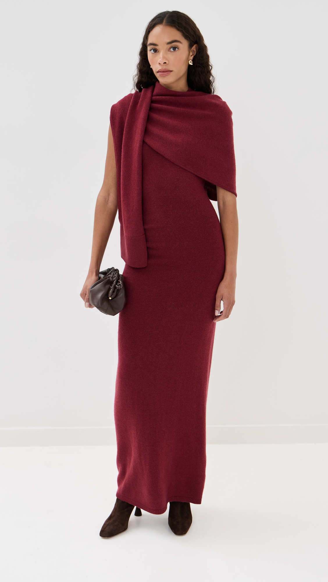 - Fabric: Mid-weight, super-stretch knit - Attached scarf detail - Ruching at waist - Maxi length - Crew neck - Sleeveless - Pullover design, no closure - Shell: 90% wool/10% recycled cashmere - Unlined - Dry clean - Imported, China Style #JONDB31815