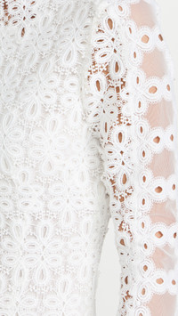 - Fabric: Heavyweight, non-stretch guipure lace - Mock neck - Long sleeves with hidden zip cuffs - Ruffle hem - Sheer mesh trim - Hook-and-eye and hidden zip at back - Shell: 100% polyester - Lined - Lining: 90% polyester/10% spandex - Dry clean - Imported, China Style #JONDB30887 Size & Fit Model measurements: - Size 0: Vie (5'8.5") - Size 12: Natasha (5'9") usually wears size 10-12 Measurements from size 0 Length: 33.75in / 86.0cm, from shoulder