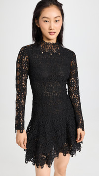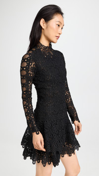 - Fabric: Heavyweight, non-stretch guipure lace - Mock neck - Long sleeves with hidden zip cuffs - Ruffle hem - Sheer mesh trim - Hook-and-eye and hidden zip at back - Shell: 100% polyester - Lined - Lining: 90% polyester/10% spandex - Dry clean - Imported, China Style #JONDB30887 Size & Fit Model measurements: Size 0: Moon (5'8") Measurements from size 0 Length: 33.75in / 86.0cm, from shoulder