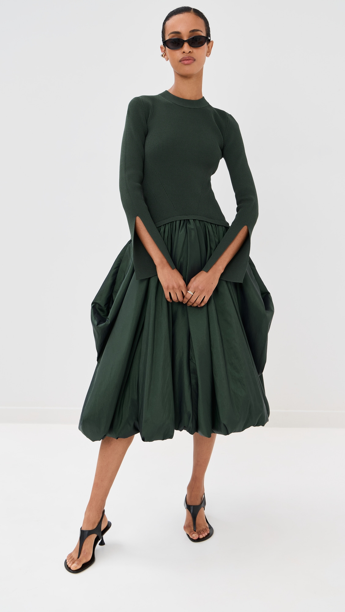 - Fabric: Mid-weight, non-stretch taffeta - Ribbed knit bodice - Bubble hem - Midi length - Mock neck - Long sleeves - Pullover design, no closure - On-seam side pockets - Shell: 83% viscose/17% elastane - Trim: 60% polyester/40% nylon - Partially lined - Lining: 100% nylon - Hand wash or dry clean - Imported, China Style #JONDB31807 Size & Fit Model measurements: Size XS: Mical (5'10") usually wears size XS Measurements from size XS Length: 45.75in / 116.0cm, from shoulder