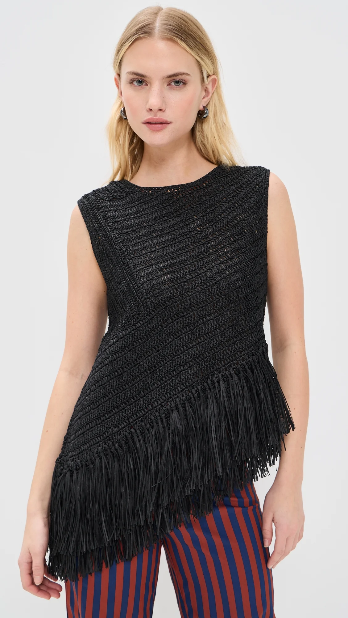 - Fabric: Mid-weight, low-stretch crochet - Asymmetrical fringe hem - Crew neck - Sleeveless - Shell: 65% polyester/35% cotton - Dry clean - Imported, China Style #SIMIL31023 Size & Fit Model measurements: Size S: Kayla (5'7.5") usually wears size XS-S Measurements from size S Length: 25.25in / 64.0cm, from shoulder