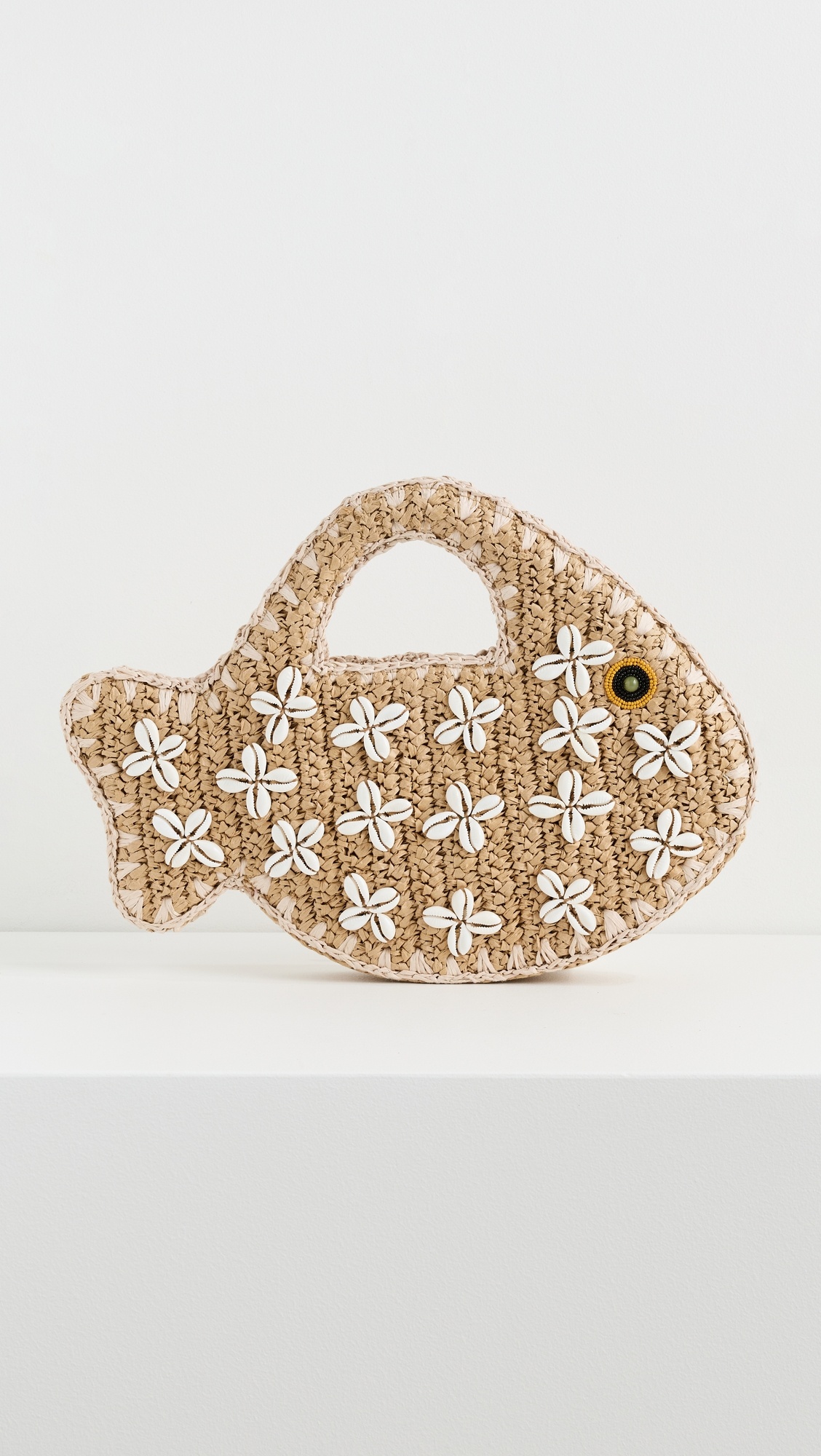 - Raffia - Fish silhouette with beaded eye - Puka shell embellishments - Magnetic closure - Patch interior pocket - Lining: Textile - Weight: 7oz / 0.2kg - Imported, China Style #SIMIL30928 Size & Fit Length: 13in / 33cm Height: 6.25in / 16cm Depth: 1.5in / 4cm Handle drop: 2.25in / 6cm