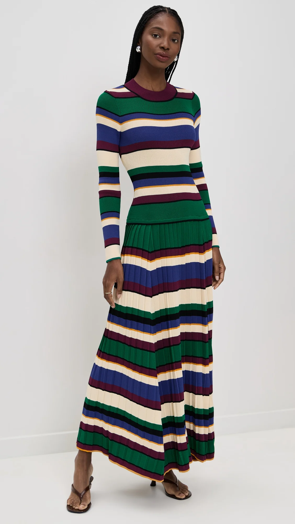- Fabric: Heavyweight ribbed knit with stretch - Stripe pattern - Pleated skirt - Maxi length - Crew neck - Long sleeves - Pullover design, no closure - Shell: 65% polyester/35% nylon - Unlined - Hand wash - Imported, China Style #SIMIL31014