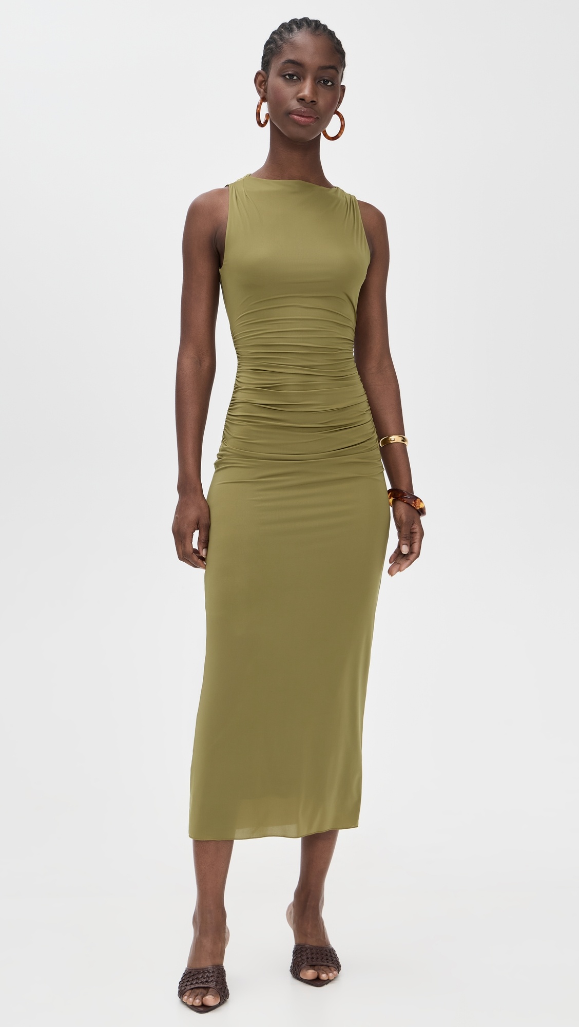 - Fabric: Lightweight, super-stretch slinky jersey - Ruching at hips - Open back with twist detail - Midi length - Boat neck - Sleeveless - Pullover design, no closure - Shell: 85% nylon/15% spandex - Lined - Dry clean - Imported, China Style #SIRRR30139