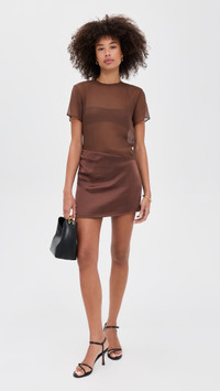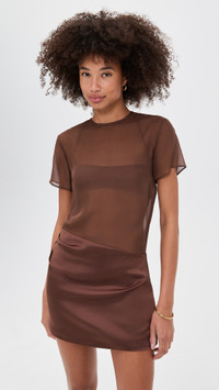 - Fabric: Lightweight, non-stretch chiffon - Satin skirt - Optional mesh bralette with adjustable strap - Mini length - Crew neck - Short sleeves - Button keyhole at back - Hidden zip at side - Semi-sheer - Shell: 100% silk - Part - Lining: 100% polyester - Dry clean - Imported, Brazil Style #SIRRR30164 Size & Fit Model measurements: Size 0: Drew (5'8") usually wears size 0 Measurements from size 0 Length: 30.75in / 78.0cm, from shoulder
