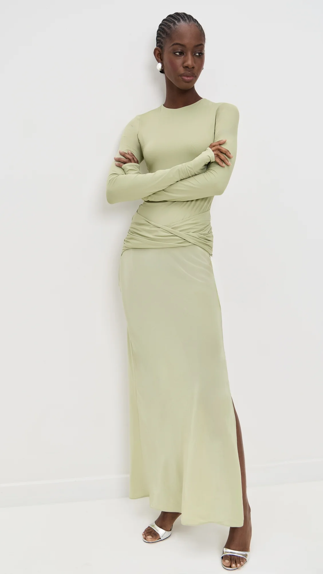 - Fabric: Lightweight, non-stretch crepe - Super-stretch jersey bodice - Twist detail at waist - Maxi length - Crew neck - Long sleeves - Pullover design, no closure - Shell: 70% viscose/30% silk - Lined - Lining: 87% nylon/13% spandex - Wash cold - Imported, China Style #SIRRR30152