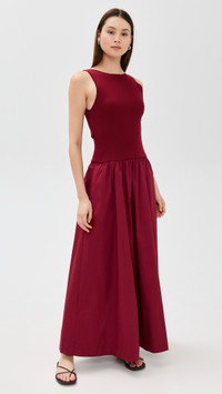 - Fabric: Mid-weight, non-stretch poplin - Knit bodice - Gathered drop waist - Cutout at back - Maxi length - Boat neck - Sleeveless - Pullover design, no closure - On-seam side pockets - Shell: 53% viscose/47% recycled polyester - Trim: 100% cotton - Unlined - Hand wash - Imported, China Style #STAGN30128