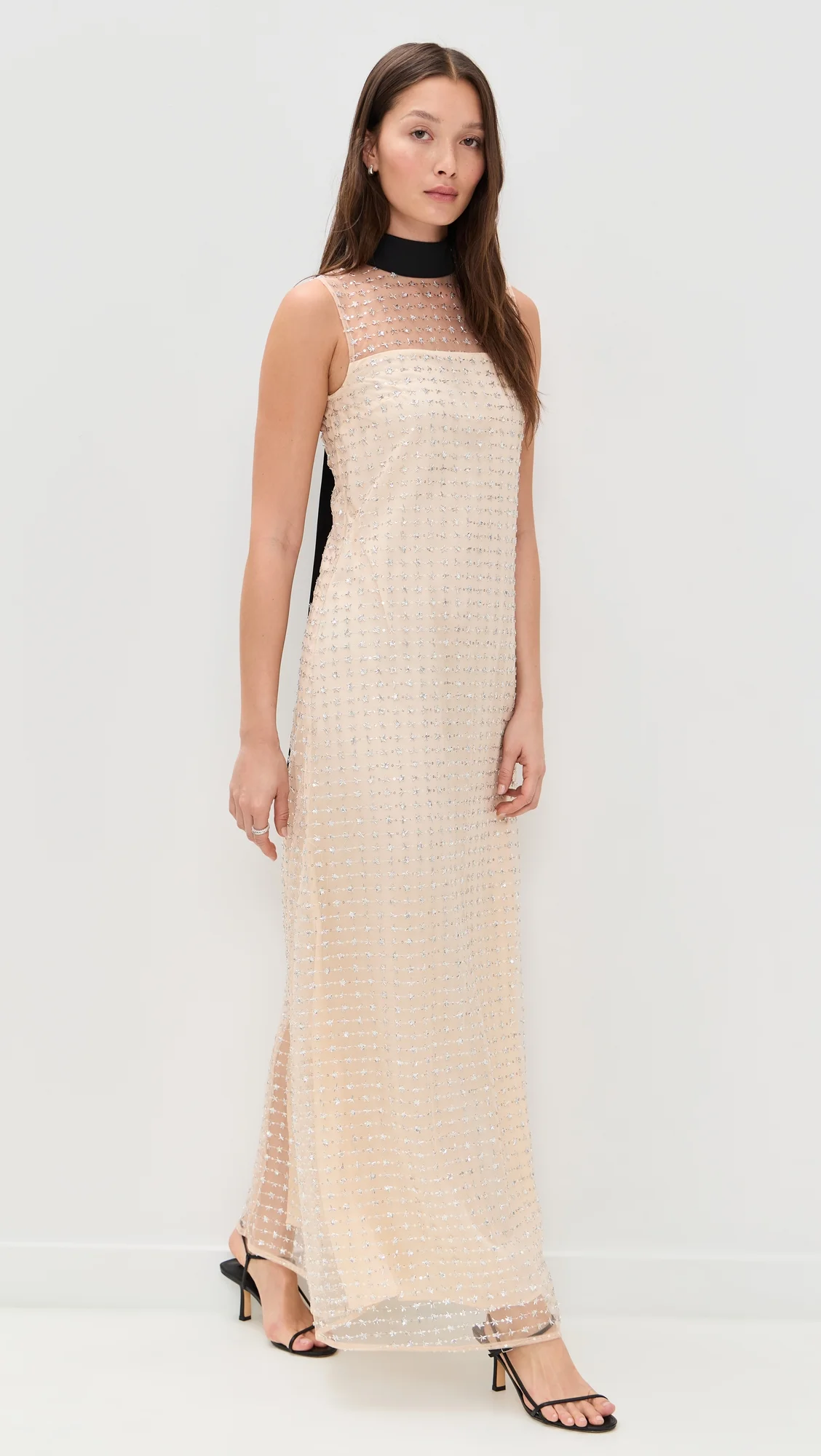 - Fabric: Lightweight, non-stretch mesh - Allover sequin and bead embellishments - Contrast grosgrain tie at neckline - Maxi length - Mock neck - Sleeveless - Hidden zip at back - Shell: 100% polyester - Lined - Dry clean - Imported, Vietnam Style #STAUD32896