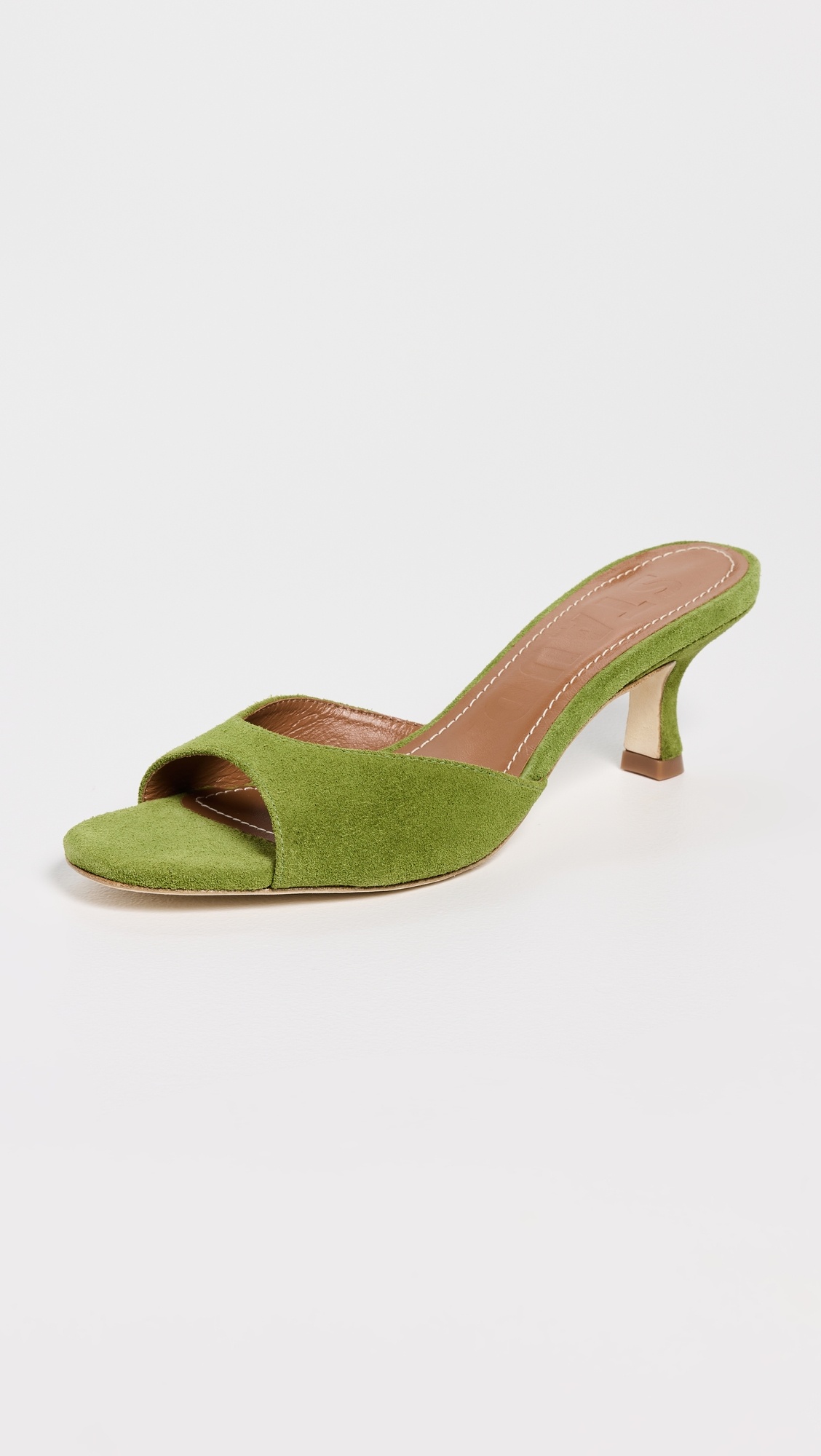 - Upper: Suede - Lightly padded footbed - Lining: Leather - Kitten heel - Slip on - Open toe - Leather sole with rubber heel cap - Imported, Brazil - This item cannot be gift-boxed Style #STAUD32850