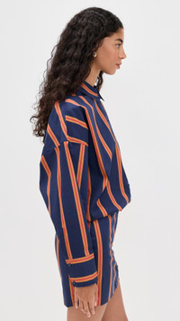 - Fabric: Mid-weight stretch weave - Stripe print - Gathered waist and fitted skirt - Mini length - Collared neck - Long sleeves with button cuffs - Button placket - Shell: 98% cotton/2% elastane - Lined - Lining: 100% cotton - Wash cold - Imported, Vietnam Style #STAUD32751