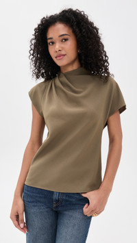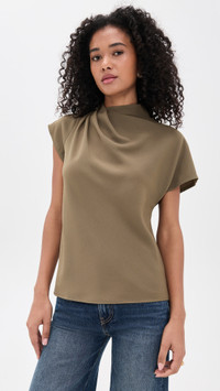 - Fabric: Lightweight stretch crepe - Asymmetrical sleeves - Draped detailing - Mock neck - Short sleeves - Hook-and-eye and hidden zip at back - Shell: 70% acetate/30% polyester - Unlined - Dry clean - Imported, China Style #STAUD32795 Size & Fit Customers say: Runs large; please size down. Model measurements: Size 0: Eyshila (5'10") usually wears size 0 Measurements from size 0 Length: 23.5in / 60.0cm, from shoulder