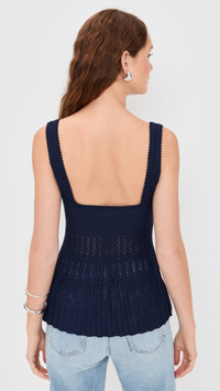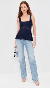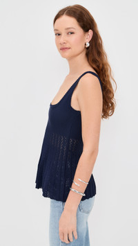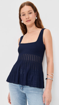 - Fabric: Lightweight, super-stretch knit - Peplum hem with stripe pattern - Picot trim - Square neckline - Shell: 80% viscose/20% nylon - Hand wash - Imported, China - Sleeveless Style #STAUD32653 Size & Fit Model measurements: Size XS: Maia (5'10") usually wears size XS Measurements from size XS Length: 21.75in / 55.0cm, from shoulder