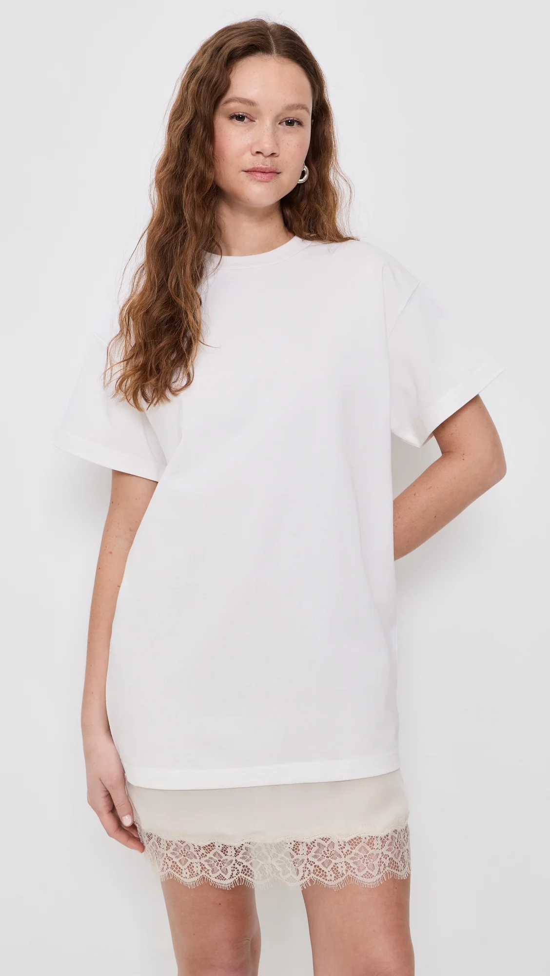 - Fabric: Mid-weight stretch jersey - Chiffon hem with lace trim - Mini length - Crew neck - Short sleeves - Pullover design, no closure - Shell: 100% cotton - Trim: 100% silk - Unlined - Hand wash - Made in the USA Style #STAUD33097 Size & Fit Model measurements: Size XS: Maia (5'9.5") usually wears size XS Measurements from size XS Length: 34.75in / 88.0cm, from shoulder