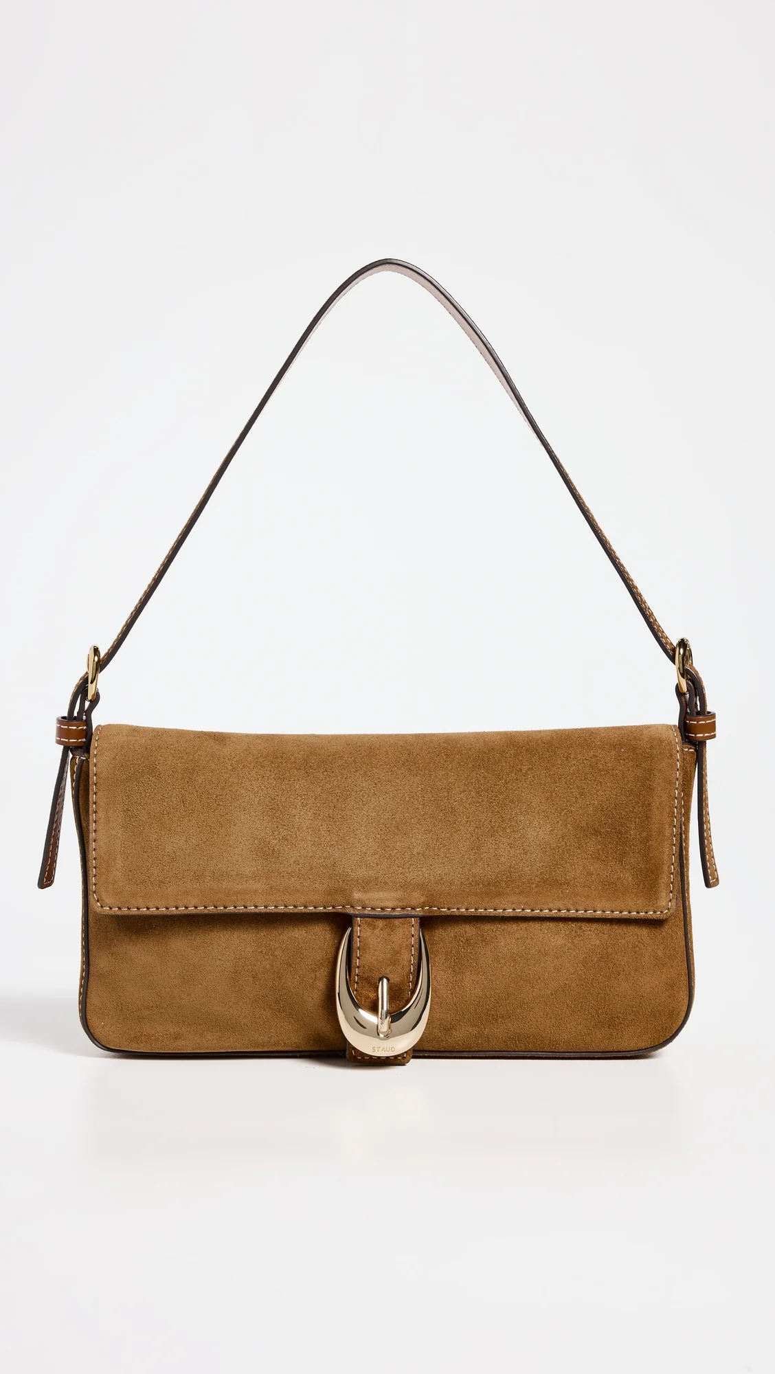 - Cowhide suede - Polished gold-tone hardware - Fold-over flap with magnetic closure - Suede lining - Weight: 10oz / 0.28kg - Imported, Vietnam Style #STAUD32226 Size & Fit Length: 9.75in / 25cm Height: 5.5in / 14cm Depth: 1.5in / 4cm Handle drop: 7.75in / 20cm