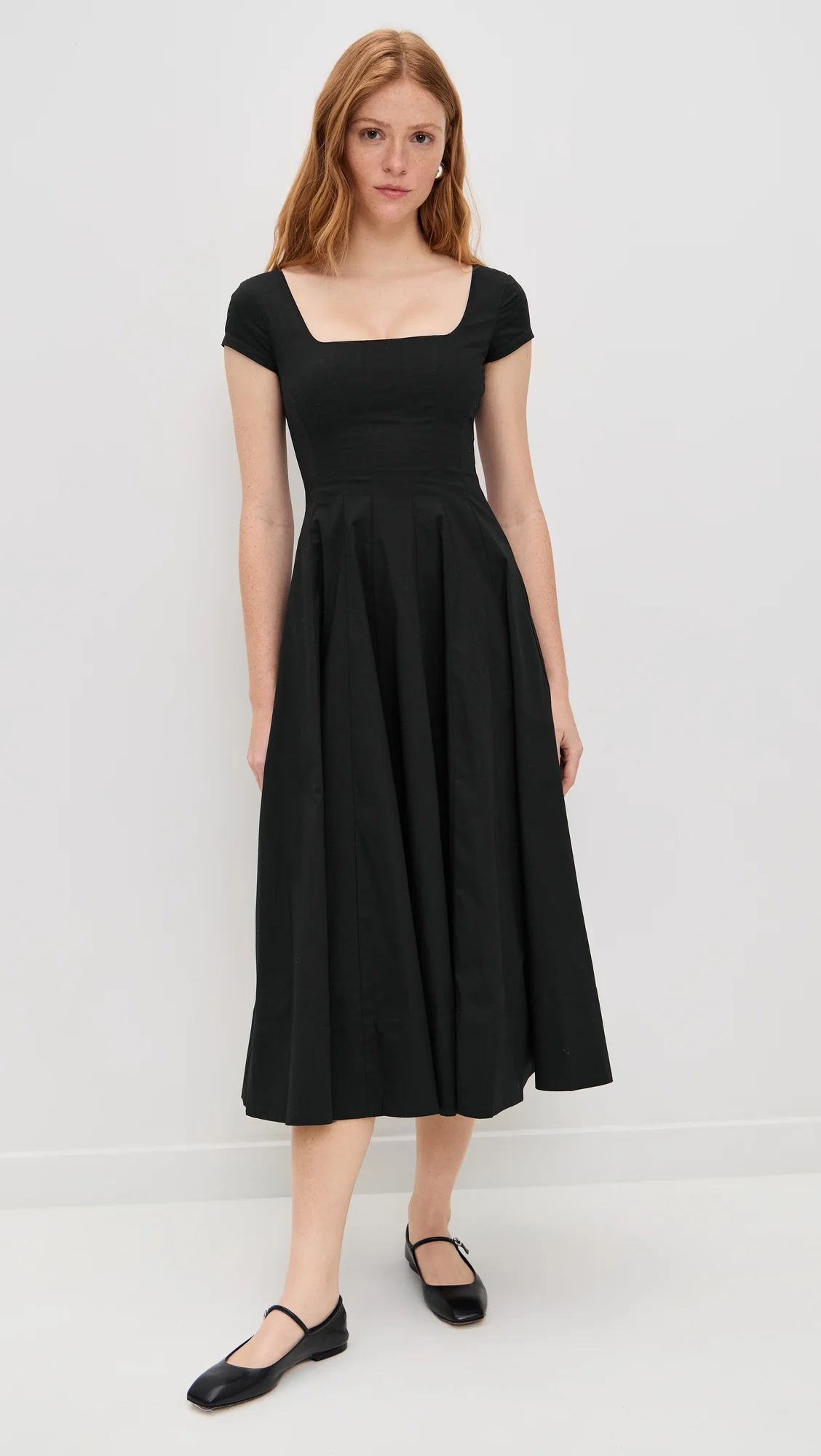 - Fabric: Mid-weight stretch poplin - Paneled design - Midi length - Square neckline - Short cap sleeves - Hook-and-eye and hidden zip at back - Shell: 98% cotton/2% elastane - Lined - Lining: 100% cotton - Wash cold - Imported, Vietnam Style #STAUD32947
