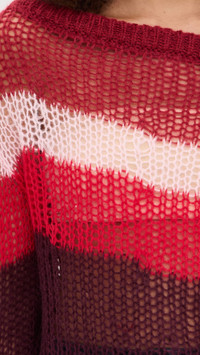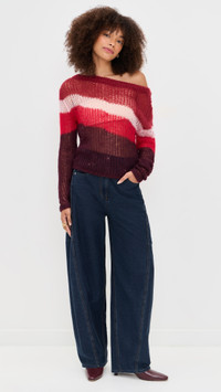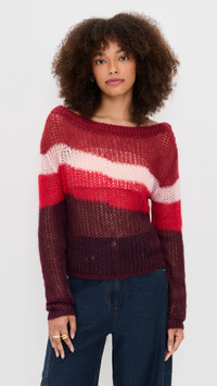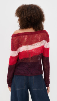 - Fabric: Lightweight open knit - Striped pattern - Off-shoulder neckline - Long sleeves - Shell: 36% nylon/30% modal/27% acrylic/7% wool - Dry clean - Imported, China Style #STAUD32788 Size & Fit Model measurements: Size XS: Alexis (5'8") usually wears size XS-S Measurements from size S Length: 18.5in / 47.0cm, from shoulder