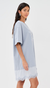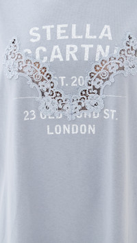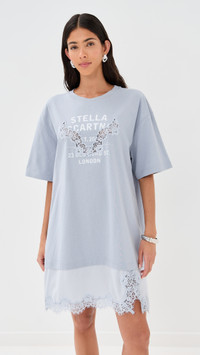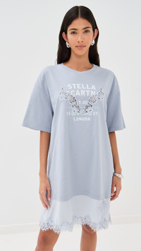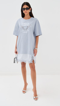 - Fabric: Lightweight, low-stretch jersey - Stella McCartney is part of The Climate Pledge, a commitment to reaching net-zero carbon emissions by 2040 - Chiffon hem and lace trim - Logo lettering at front - Knee length - Crew neck - Short sleeves - Pullover design, no closure - Shell: 100% cotton - Trim: 47% polyamide/39% cotton/14% viscose - Unlined - Dry clean - Made in Portugal Style #STELA22264 Size & Fit Model measurements: Size S: Brittany (5'9.5") usually wears size XS Measurements from size S Length: 36.25in / 92.0cm, from shoulder