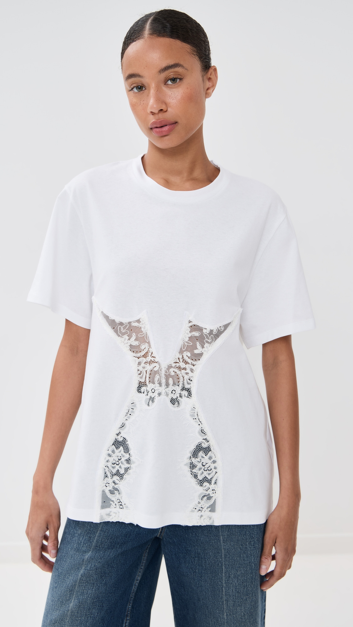- Fabric: Lightweight stretch jersey - Stella McCartney is part of The Climate Pledge, a commitment to reaching net-zero carbon emissions by 2040 - Sheer lace trim - Crew neck - Short sleeves - Shell: 100% cotton - Trim: 55% polyamide/45% viscose - Wash cold - Made in Portugal Style #STELA22269 Size & Fit Model measurements: Size XS: Drew (5'8") usually wears size XS-S Measurements from size S Length: 27.5in / 70.0cm, from shoulder