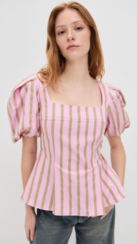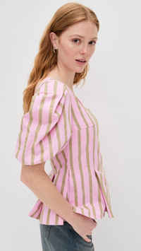 - Fabric: Lightweight, non-stretch poplin - Flocked jacquard stripes - Pleated waist with flared hem - Square neckline - Short puff sleeves with elastic cuffs - Hook-and-eye and hidden zip at back - Shell: 100% cotton - Wash cold - Imported, China Style #SGOYA30317