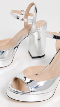 - Upper: Calfskin - Metallic finish - Lining: Leather - Block heel - Buckle ankle strap - Open toe - Leather sole with rubber heel cap - Made in Spain - This item cannot be gift-boxed Style #STUAR21507 Size & Fit Customers say: Runs small; please size up. Heel: 3.75in / 95mm Platform: 0.75in / 20mm