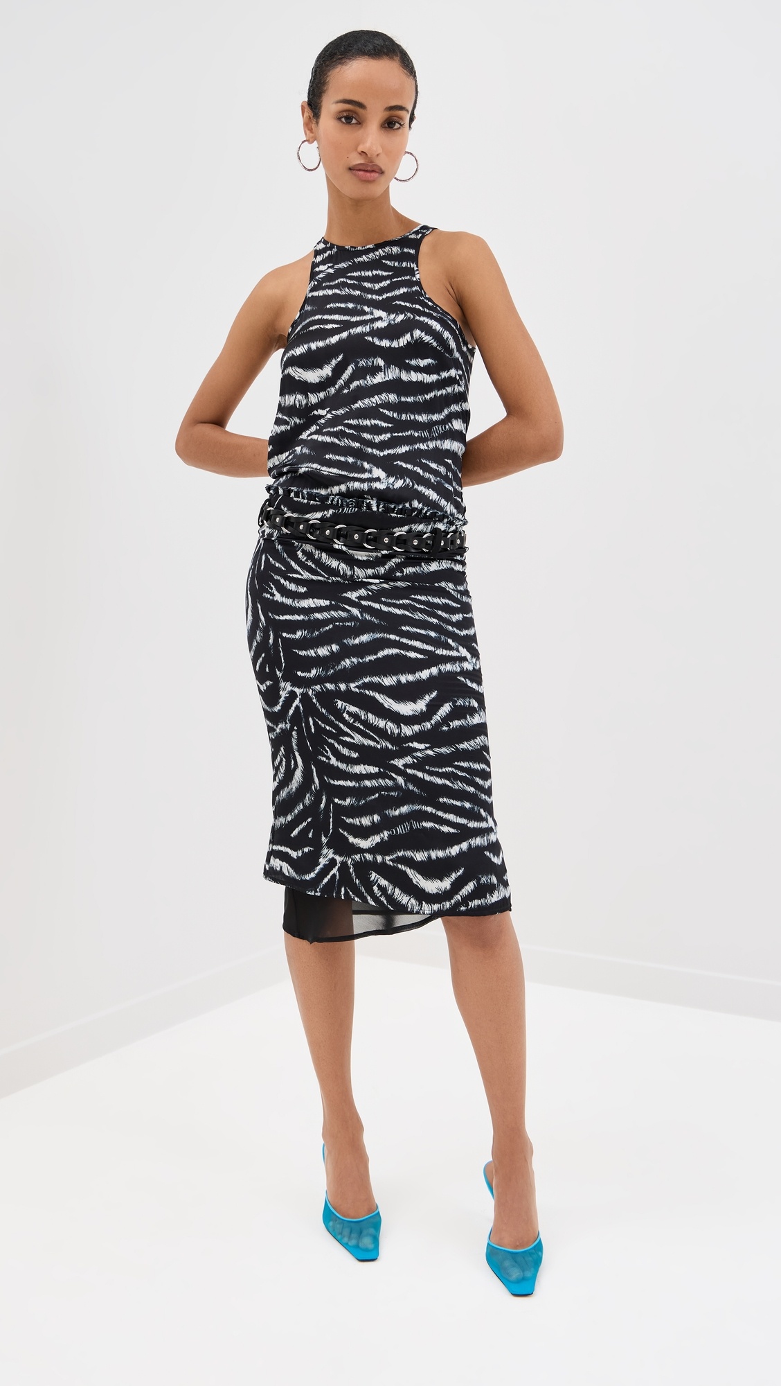 - Fabric: Lightweight stretch satin - Drop waist with ruffle trim - Zebra print - Midi length - Crew neck - Sleeveless - Covered elastic waistband - Shell: 52% viscose/38% silk/10% elastane - Partially lined - Lining: 100% polyester - Dry clean - Made in Italy Style #ATICO30016