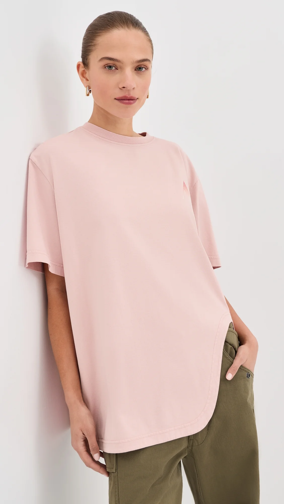 - Fabric: Lightweight stretch jersey - Faux cross stitch logo print - Asymmetrical hem with split at side - Dropped shoulders - Crew neck - Elbow-length sleeves - Shell: 100% cotton - Wash cold - Made in Portugal Style #ATICO30122 Size & Fit Model measurements: Size 36: Margaret (5'11") usually wears size 36 Measurements from size 36 Length: 29.25in / 74.0cm, from shoulder