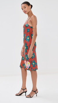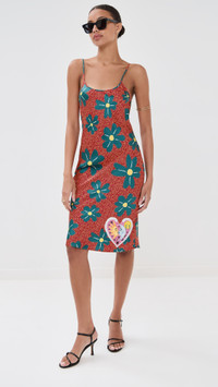 - Fabric: Lightweight, non-stretch charmeuse - Floral print - Embroidered heart patch at front hem - Mini length - Scoop neck - Sleeveless - Pullover design, no closure - Shell: 100% silk - Unlined - Dry clean - Made in Italy Style #ELDER30011