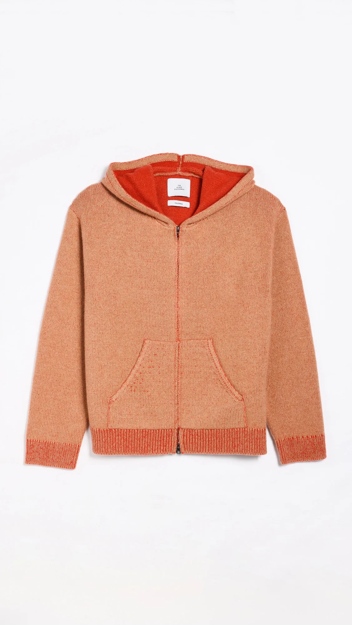 - Fabric: Mid-weight stretch knit - This style is unisex. For men’s sizing, take your usual size. For women’s sizing, take one size down from your usual size - Ribbed trim - Hooded neckline - Long sleeves - Two-way zip closure - Kangaroo pocket - Shell: 100% cashmere - Dry clean - Made in the USA of imported materials Style #ELDER30079 Size & Fit This style is unisex. For men’s sizing, take your usual size. For women’s sizing, take one size down from your usual size. Model measurements: Size M: Gordon (6'1") Measurements from size S Length: 24.75in / 63.0cm, from shoulder