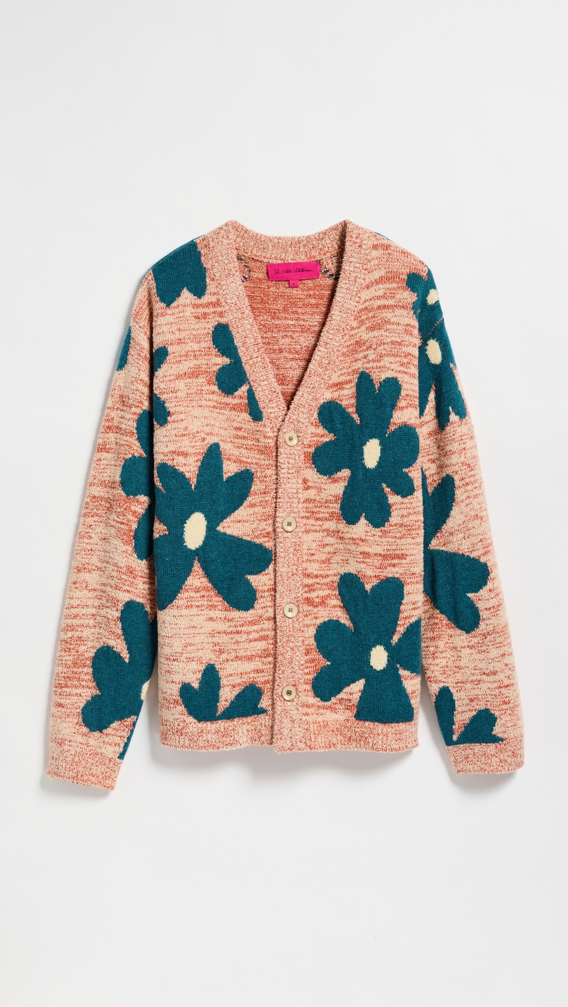 - Fabric: Mid-weight stretch knit - Floral print - Intarsia sun and moon pattern at back - V neck - Long sleeves - Button placket - Shell: 75% cashmere/9% merino wool/9% nylon/7% silk - Dry clean - Made in the USA Style #ELDER30018