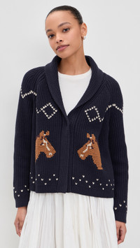 - Fabric: Mid-weight shaker knit with stretch - Horse graphics at front and back - Shawl collar - Long sleeves - Open placket - Shell: 60% cotton/40% acrylic - Dry clean - Imported, China Style #TGREA31585 Size & Fit Model measurements: Size 0: Alexis (5'8") usually wears size 0-1 Measurements from size 0 Length: 21.25in / 54.0cm, from shoulder