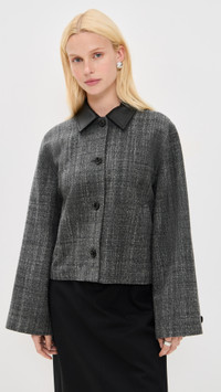 - Fabric: Mid-weight, non-stretch wool weave - Leather trim - Collared neck - Long sleeves with button cuffs - Button placket - Shell: 83% wool/17% polyamide - Trim: 100% lambskin - Lined - Lining: 100% polyester - Dry clean - Imported, Vietnam Style #THEOR45045 Size & Fit Model measurements: Size M: Annalise (5'8") usually wears size XS Measurements from size M Length: 22in / 56.0cm, from shoulder
