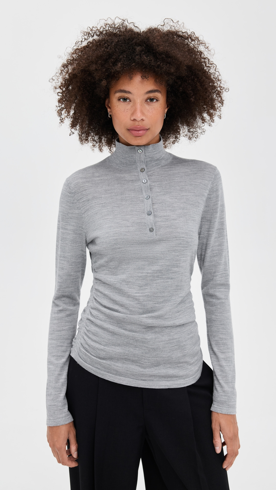 - Fabric: Lightweight ribbed jersey with stretch - Ruching at sides - Mock neck - Long sleeves - Partial button placket - Shell: 100% wool - Dry clean - Imported, China Style #THEOR44978