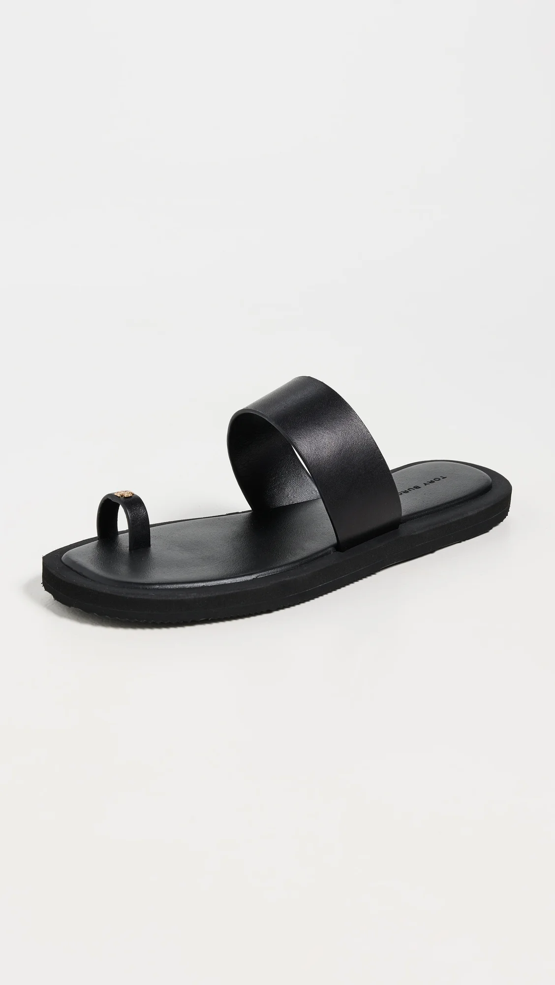 - Upper: Cowhide - Toe strap with gold-tone logo emblem - Cushioned leather footbed - Lining: Leather - Slip on - Open toe - Rubber sole - Imported, Brazil - This item cannot be gift-boxed Style #TORYB50967 Size & Fit This shoe is available in whole sizes only. If you wear a half size, please size up.
