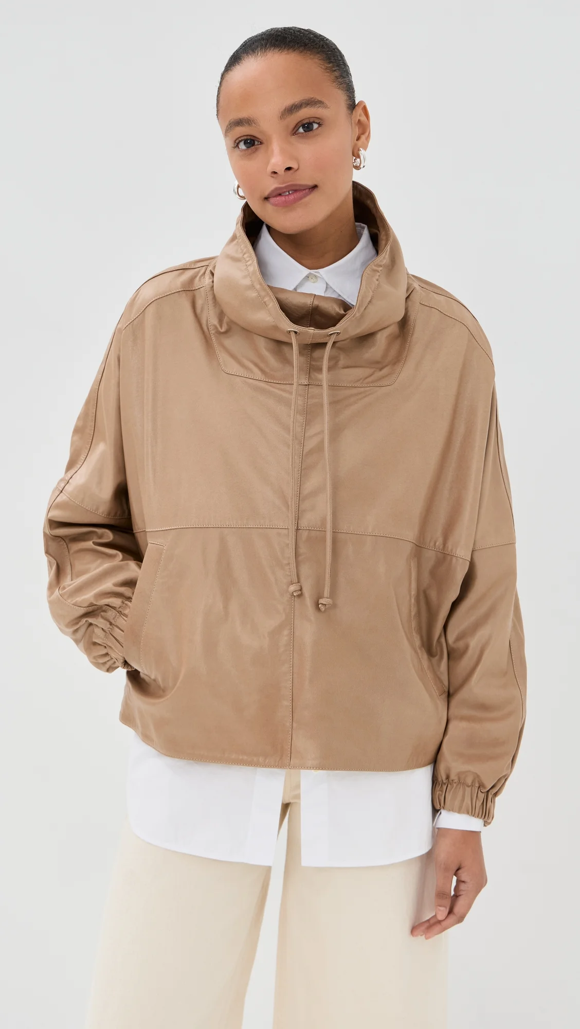 - Fabric: Mid-weight, non-stretch lambskin - Drawstring neckline - Dropped shoulders - Turtleneck - Long sleeves with elastic cuffs - Slant hip pockets - Shell: 100% leather - Lined - Lining: 100% silk - Leather clean - Imported, Turkey Style #TWPPP30202