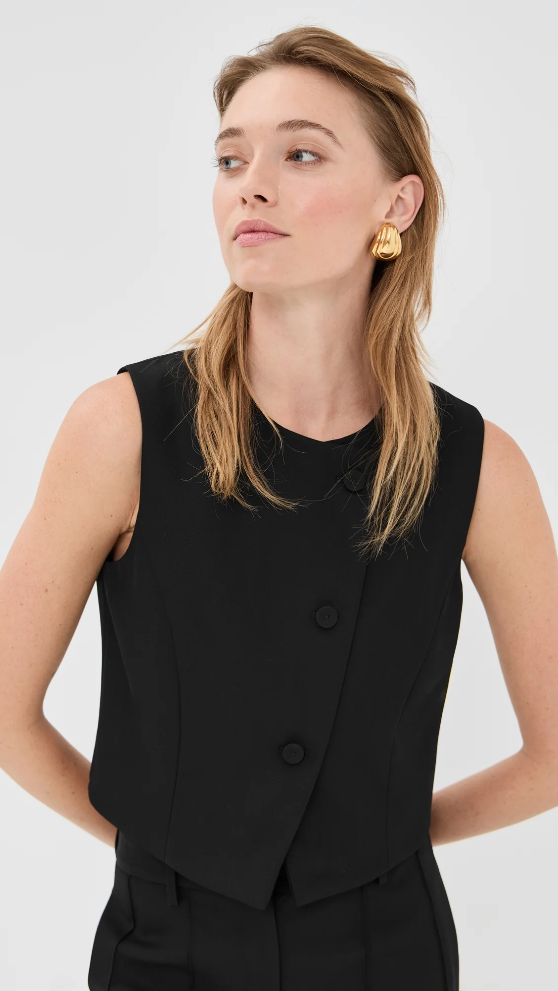 - Fabric: Mid-weight, non-stretch crepe suiting - Crew neck - Sleeveless - Single-breasted button placket - Shell: 100% wool - Lined - Lining: 93% silk/7% elastane - Dry clean - Made in the USA Style #TWPPP30191