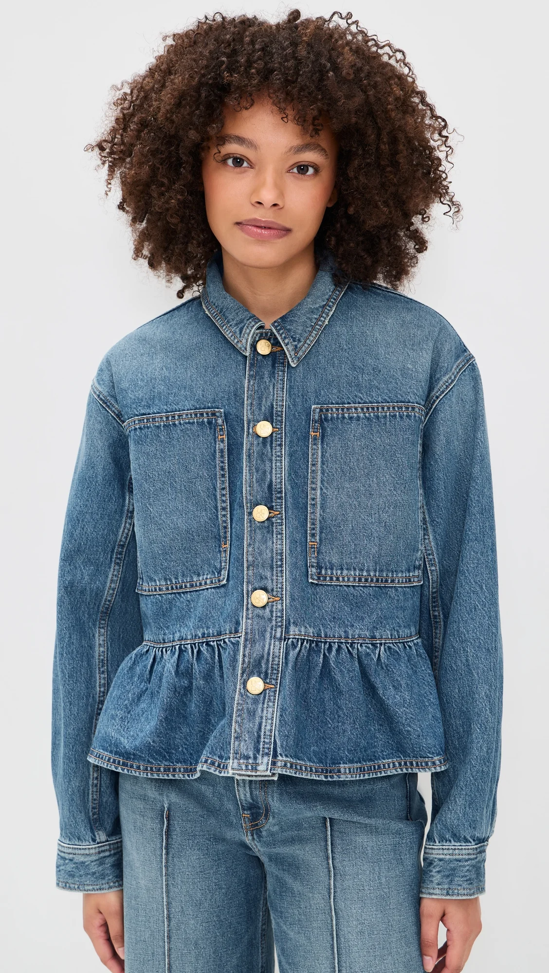 - Fabric: Mid-weight, non-stretch denim - Gold-tone buttons - Ruffled at hem - Collared neck - Long sleeves with button cuffs - Button placket - Patch front pockets - Shell: 100% cotton - Unlined - Wash cold - Made in the USA Style #ULLAJ23539 Size & Fit Model measurements: Size S: Alexis (5'8") usually wears size XS-S Measurements from size S Length: 22.5in / 57.0cm, from shoulder