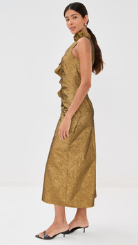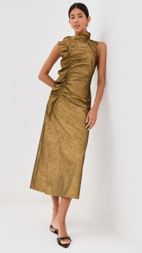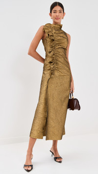 - Fabric: Lightweight, super-stretch metallic weave - Ruched detailing with ruffle trim - Crinkled finish - Midi length - Mock neck - Sleeveless - Hook-and-eye and hidden zip at back - Shell: 48% polyester/39% polyamide/13% spandex - Unlined - Dry clean - Imported, China Style #ULLAJ23265 Size & Fit Model measurements: Size 0: Brittany (5'9.5") usually wears size 0 Measurements from size 0 Length: 51.25in / 130.0cm, from shoulder
