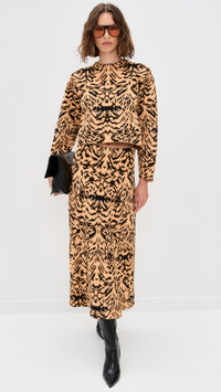 - Fabric: Mid-weight, super-stretch jacquard knit - Tiger stripe pattern - Covered elastic waistband - Shell: 83% viscose/17% polyester - Dry clean - Imported, China Style #ULLAJ23259 Size & Fit Customers say: Runs large; please size down. Model measurements: Size P: Anna (6'0") usually wears size P-S Measurements from size P Length: 33.5in / 85.0cm