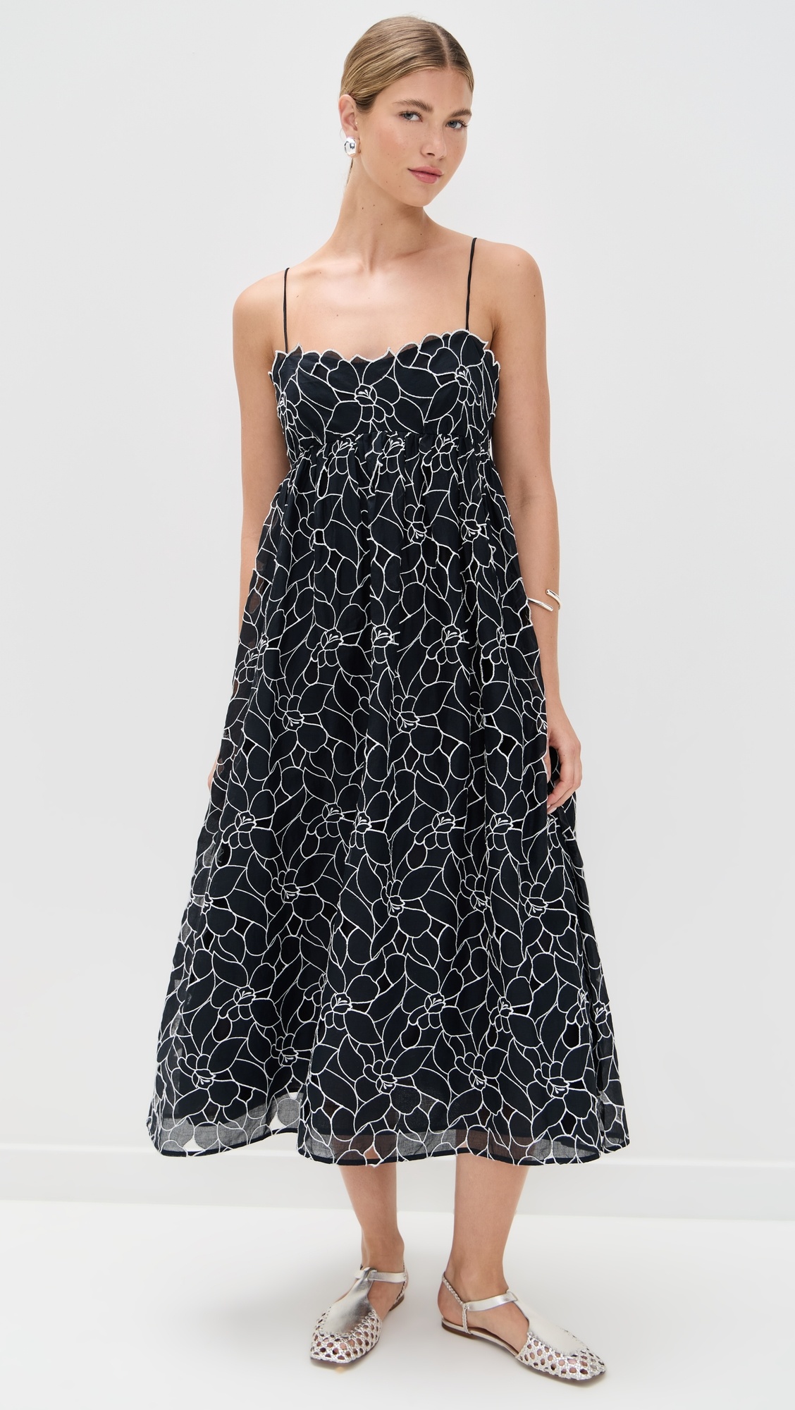 - Fabric: Mid-weight, non-stretch weave - Cutout floral design with embroidered edges - Midi length - Sweetheart neckline - Sleeveless - Hook-and-eye and hidden zip at side - Shell: 100% cotton - Lined - Lining: 100% cotton - Dry clean - Imported, India Style #ULLAJ23182 Size & Fit Features an empire waist and midi length. Cotton fabric is mid-weight and has an airy feel. Shopbop’s expert stylist says: Runs large. Please size down Model measurements: Size 2: Abigael (5'10") usually wears size 2 Measurements from size 2 Length: 48.75in / 124.0cm, from shoulder